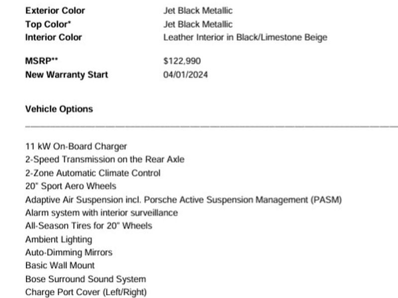 The vehicle has automated speed control that adjusts to maintain a safe following distance, enhancing highway driving convenience. This model offers Android Auto for seamless smartphone integration. This large car offers Apple CarPlay for seamless connectivity. Engulf yourself with the crystal clear sound of a BOSE sound system in this model. Protect this 2024 Porsche Taycan from unwanted accidents with a cutting edge backup camera system. This large car is painted with a sleek and sophisticated black color. Maintaining a stable interior temperature in this model is easy with the climate control system. Easily set your speed in this Porsche Taycan with a state of the art cruise control system. Increase or decrease velocity with the touch of a button. This 2024 Porsche Taycan has a Electric Motor high output engine. Bluetooth® technology is built into the Porsche Taycan, keeping your hands on the steering wheel and your focus on the road. Heated seats for those cold winter days are included in this 2024 Porsche Taycan . This 2024 Porsche Taycan is pure luxury with a heated steering wheel. This Porsche Taycan stays safely in its lane with Lane Keep Assist. This is one of the largest cars available. The leather seats in the vehicle are a must for buyers looking for comfort, durability, and style. Help alleviate lower back pain with the driver seat lumbar support in this model. The installed navigation system will keep you on the right path. A front power adjustable seat increases driver comfort. Your passengers will enjoy the rear bucket seats in this large car. The rear heated seats in this Porsche Taycan makes for happy winter passengers.